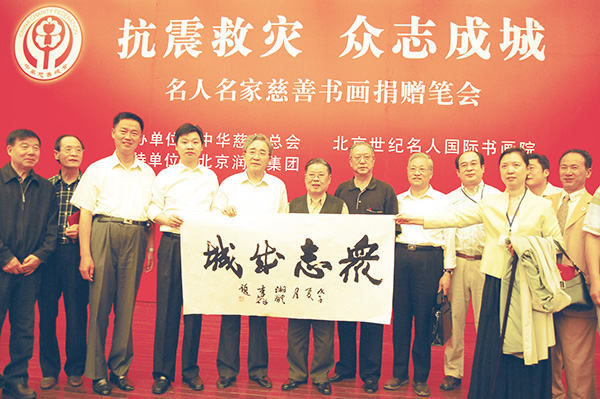 2008年5月24日,中华慈善总会、北京世纪名人国际书画院在全国政协礼堂联合主办“抗震救灾 众志成城”名人名家慈善书画捐赠笔会。